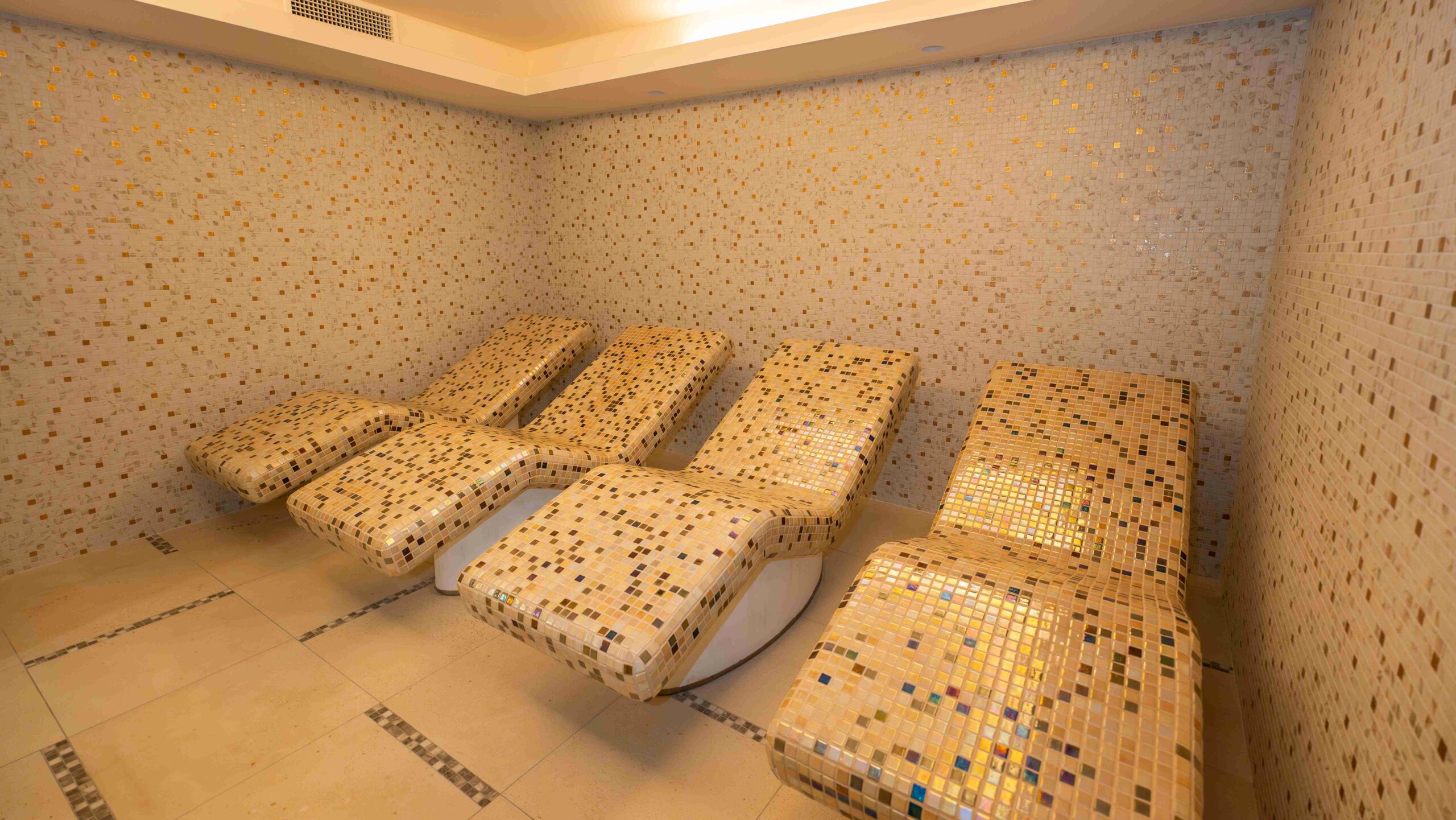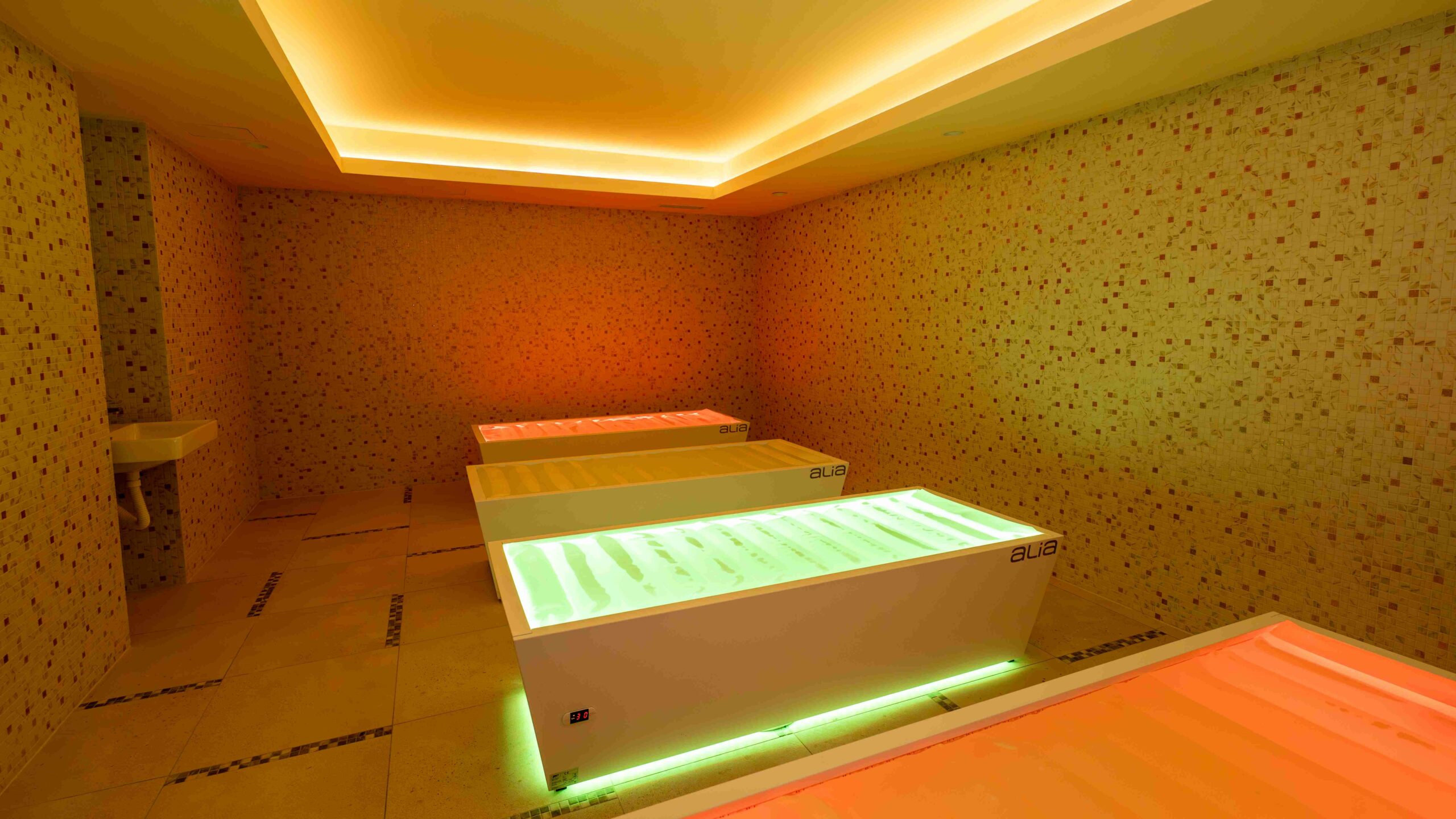 Relax soba sa vodenim krevetima predstavlja prostor namenjen potpunom opuštanju i smanjenju stresa, gde su glavni elementi topli vodeni kreveti koji se prilagođavaju telu i pružaju osećaj bestežinskog ležanja. Gostima su na raspolaganju četiri vodena dušeka zagrejana na približno 36°C, koji ravnomerno raspoređuju težinu tela, smanjuju pritisak na kičmu i zglobove, dok blago ljuljanje i toplota vode dodatno opuštaju mišiće. Ambijent relax sobe upotpunjuju prigušeno, toplo osvetljenje i LED trake u umirujućim bojama poput plave, bež i pastelno zelene, postavljene i ispod kreveta, sa mogućnošću promene boja. Boravak u ovoj prostoriji doprinosi smanjenju napetosti i stresa, poboljšanju koncentracije, smirivanju tela i uma, kvalitetnijem snu, ublažavanju bolova u leđima, poboljšanju cirkulacije i metabolizma, kao i pravilnom radu limfnog sistema i detoksikaciji organizma.